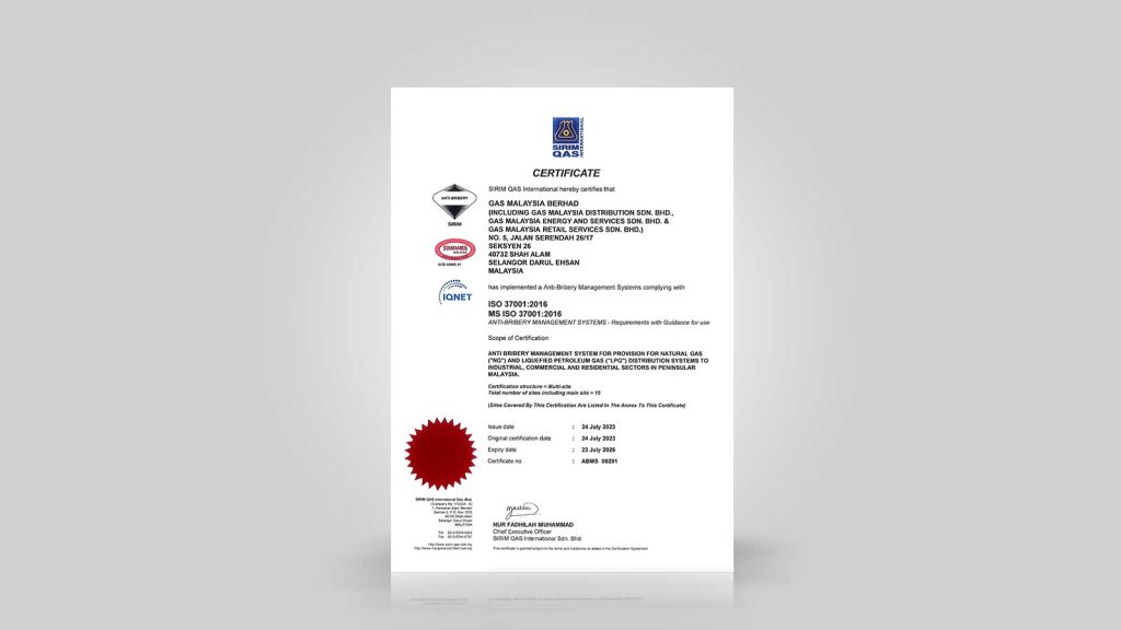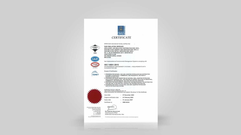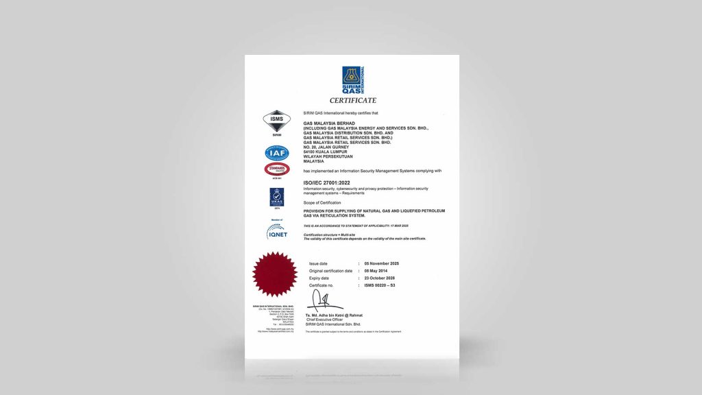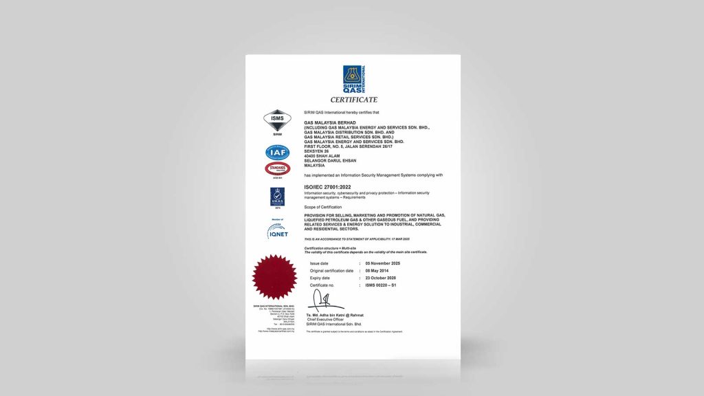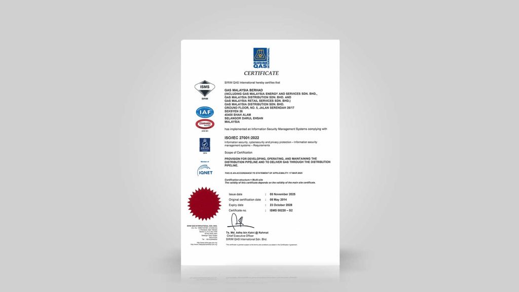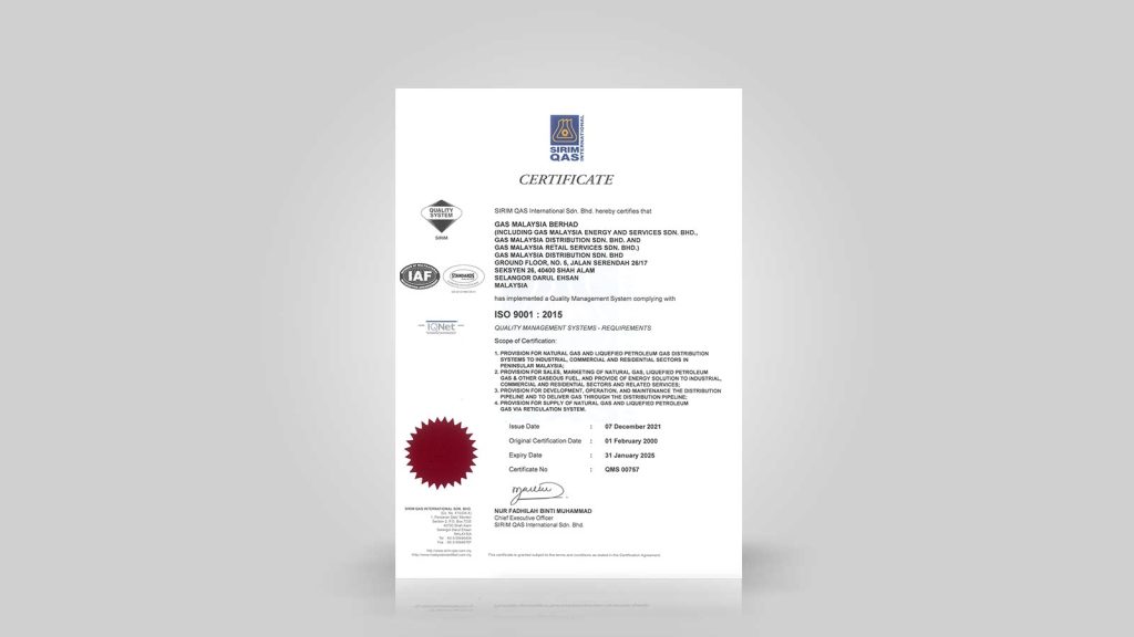 Gas Malaysia proudly achieved its first accreditation with the Quality Management Systems MS ISO 9002:1994 certificate, which was later upgraded to ISO 9001:2008.